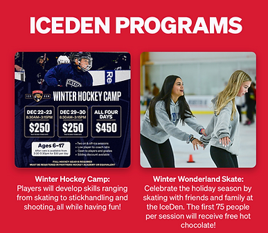 I was responsible for sourcing all information and imagery for the monthly newsletters for both the Panthers IceDen and the Baptist Health IcePlex. Examples of finalized newsletters are attached below.